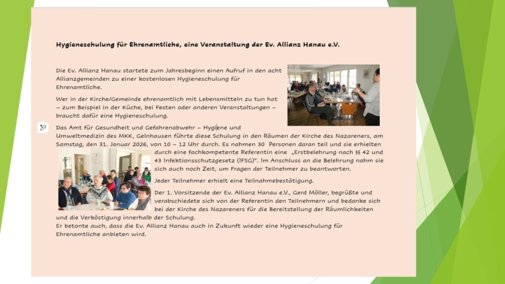 Hygieneschulung der Ev.Allianz Hanau e.V.von Gerd Moeller01.02.202601.02.2026 In der KDN – Hanau Schreibe einen Kommentar Antwort abbrechenDeine E-Mail-Adresse wird nicht veröffentlicht. Erforderliche Felder sind mit * markiertName * E-Mail-Adresse * Website Kommentar * Δ Diese Website verwendet Akismet, um Spam zu reduzieren. Erfahre, wie deine Kommentardaten verarbeitet werden.